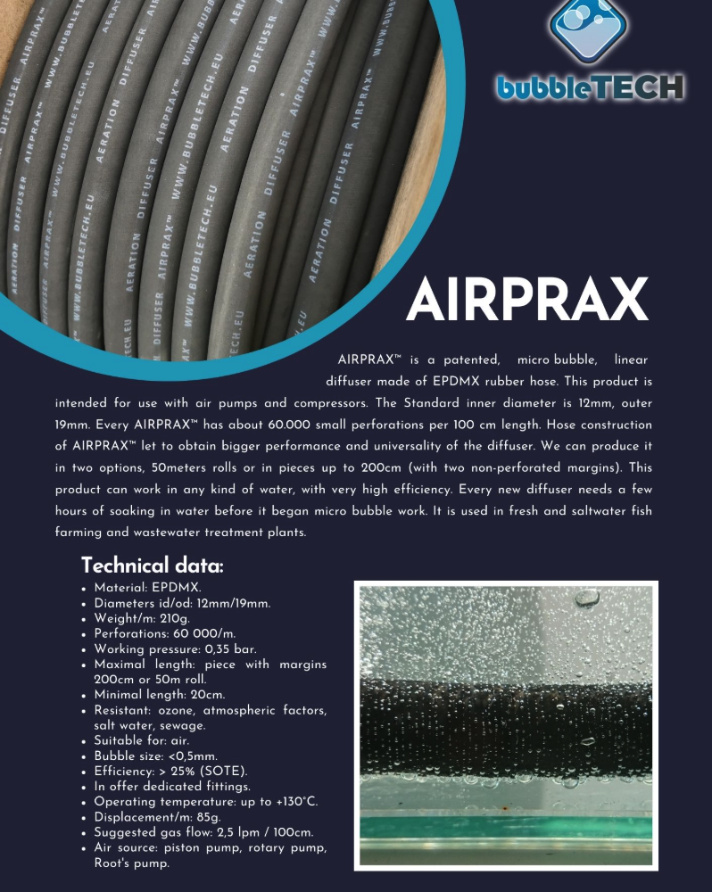 Airprax is a patented microbubble aeration diffuser manufactured from durable EPDMX rubber and featuring thousands of precision micro-perforations per metre. Its fine bubble technology maximizes surface contact with water, significantly improving dissolved oxygen levels with minimal energy input.