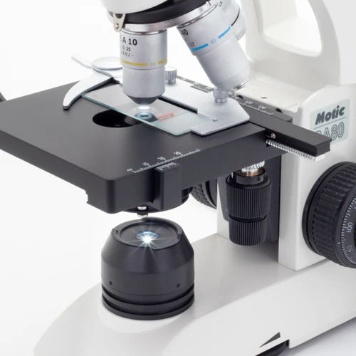 - Condenser: Abbe, N.A. 1.25 with iris diaphragm